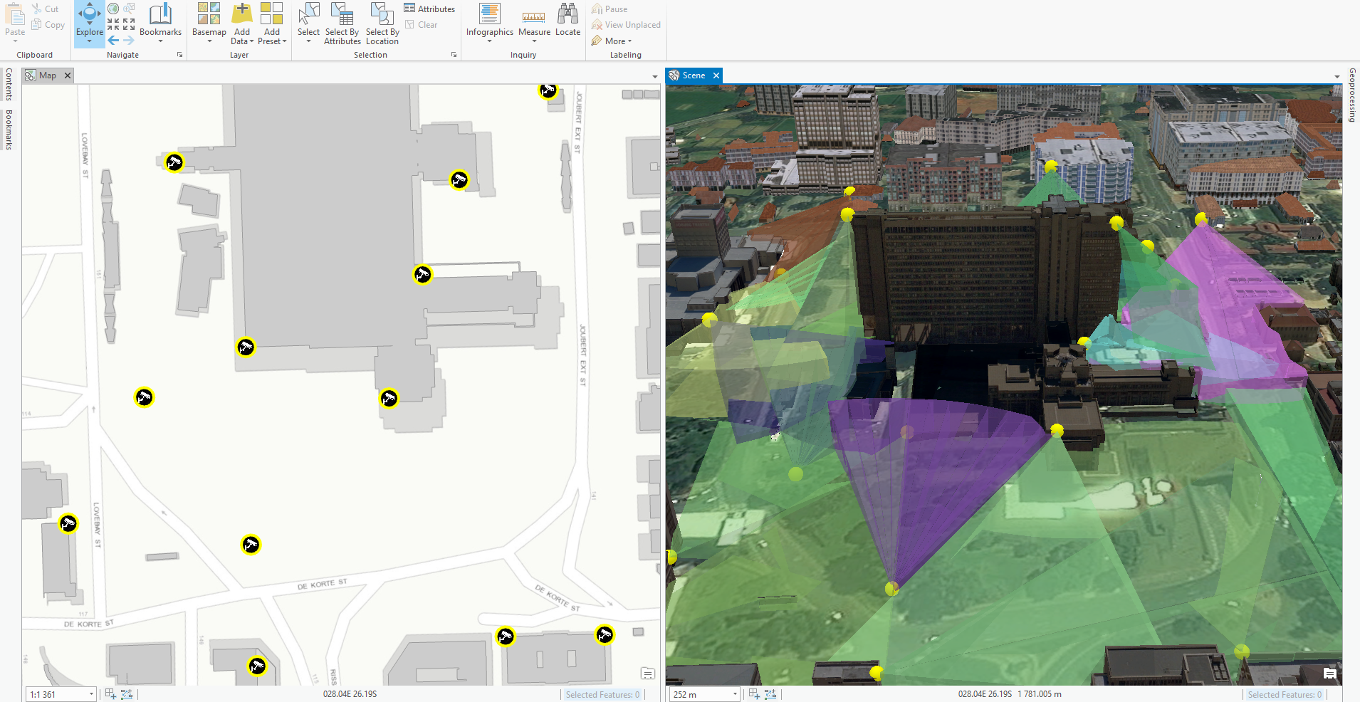 The aim of the demonstration was to show the location and coverage of CCTV cameras in downtown Johannesburg. The objective was to find the optimal coverage area in 3D by altering some of the camera attributes such as angle, direction and length. CityEngine was used to create the CCTV coverage rules, and ArcGIS Pro’s analysis abilities were utilised to determine the covered areas.