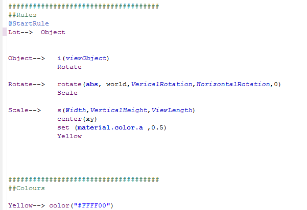 - Scale: Finally the s function scales the viewing area according to the Width, VerticalHeight and ViewLength attributes. The rule then centres, colours and changes the transparency of the 3D viewing area.