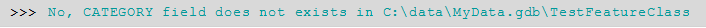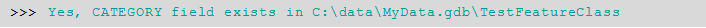 Next we will work with this code (known as calling this function) to check if a specific field name exists in our feature class. The path to our feature class is C:\data\MyData.gdb\TestFeatureClass and the field name we are going to check for is CATEGORY. These we will set in a variable as such:
