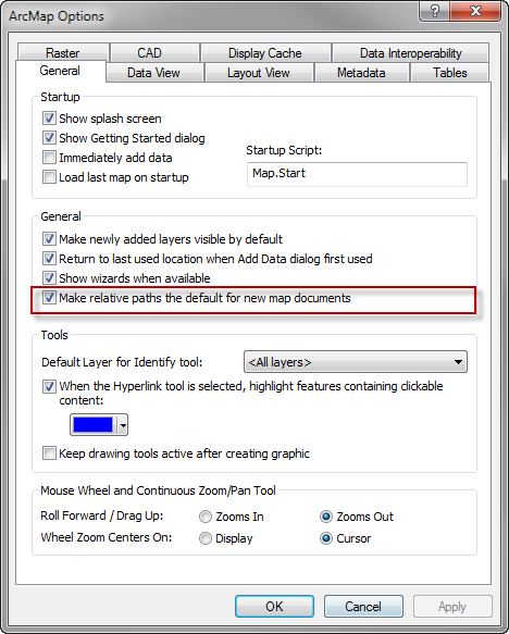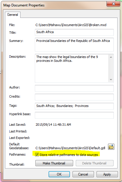 Note: To benefit from relative paths, you have to move the MXD and its data. Therefore, if you copy its parent folder with the MXD, its data and any the sub-folders, your data sources will be maintained. Now you don’t need to do the exercise of going to the file menu and changing the Map Document Properties. All new MXDs will be set to relative paths. Note that existing ones will still need to be changed in the Map Document Properties.