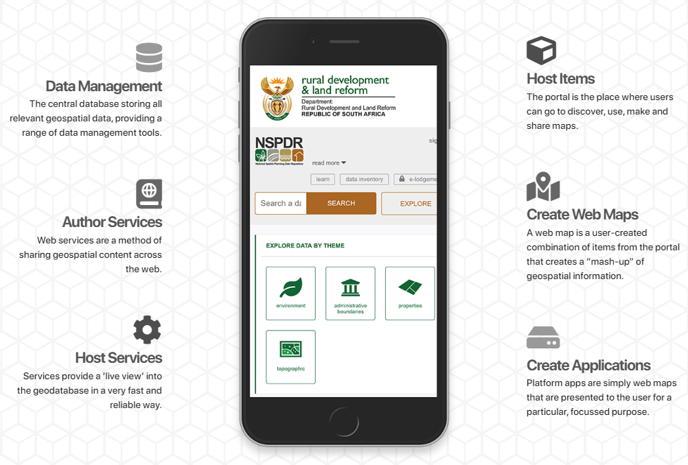 The NSPDR Ecosystem was built using Esri’s ArcGIS Platform. The Esri South Africa and Agizo Solutions Joint Venture (JV) used the platform to develop a central repository that utilises spatial data for spatial planning, monitoring, evaluation and coordination purposes. An automated E-Lodgement facility was included in the digital ecosystem.