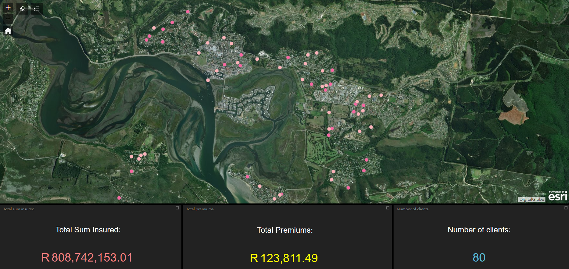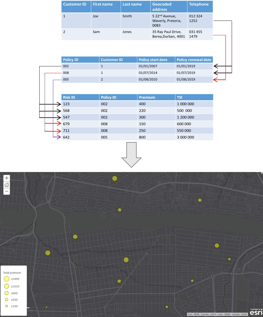 A customer table has a 1:M relationship with a policy table. The policy table has a 1:M relationship with a risk table. The premium and total sum insured (TSI) values in the risk table are important, as we want to perform spatial analysis using these values. We will therefore be aggregating the premium and total sum insured values per customer.