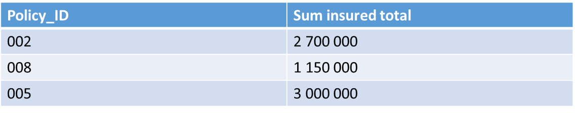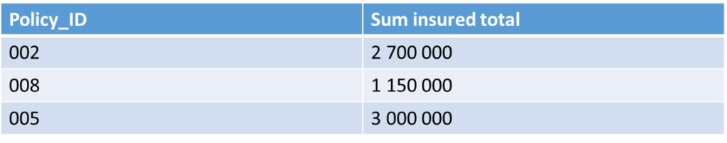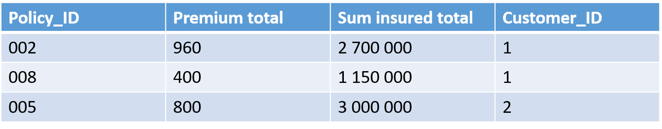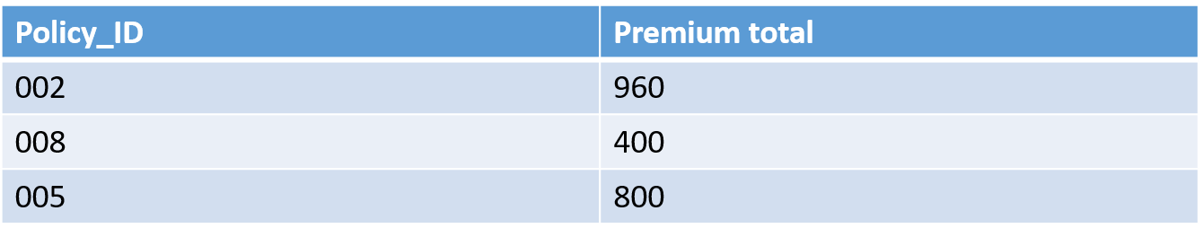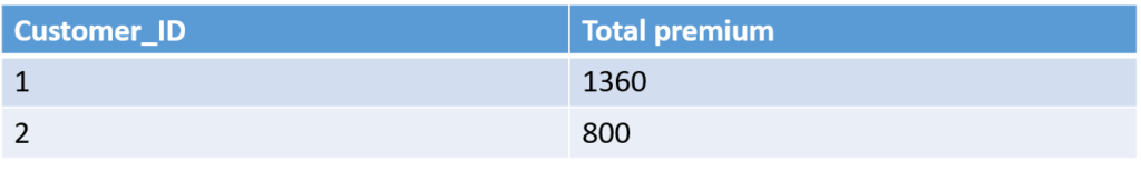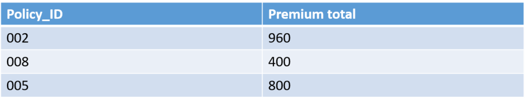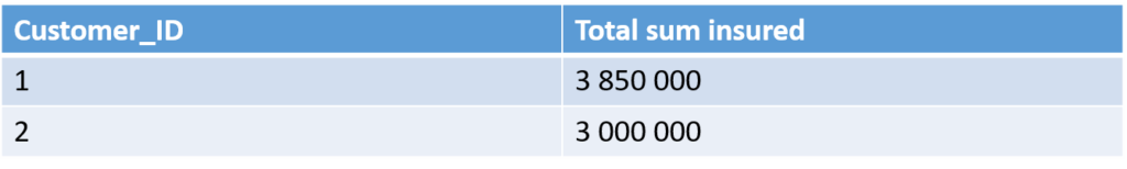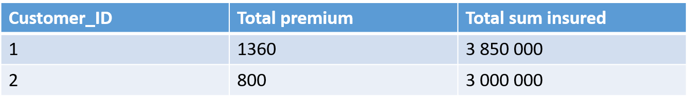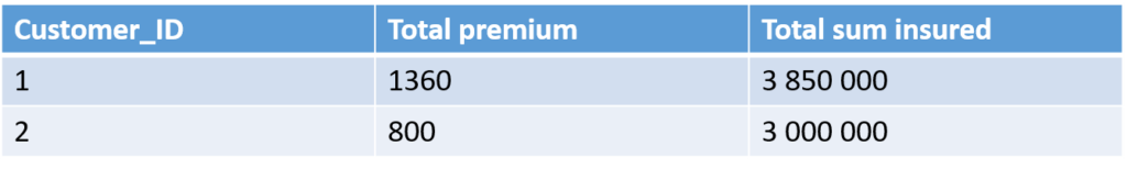 This is the same process as step 4 except that we are grouping per customer instead of policy, and we are using the total sum values calculated in step 4. The resulting tables look similar to the following: