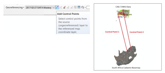 4. When Georeferencing; it is vital to have two distinctive locations in both the CAD/DWG File and the Reference Data, these two distinctive locations will be used as Control Points.georef_control_points
