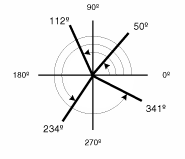 Polar angles are measured counter-clockwise from the positive x-axis, east 0⁰.